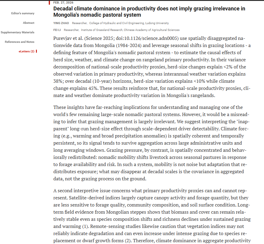 近日,鲁东大学赵英教授和中国农科院草原研究所李飞研究员在国际顶级期刊《Science》在线评论平台(eLetter)发表题为“Decadal climate dominance in productivity does not imply grazing irrelevance in Mongolia's nomadic pastoral system”的学术评论文章。该研究围绕蒙古草地生态系统中气候变化与放牧作用的关系,提出新的理论框架,对当前国际学界相关认知进行了重要补充和深化。